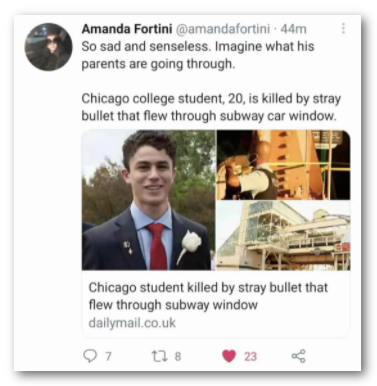 7月6日,芝加哥警方表示,一名芝加哥大学的学生 Max Solomon Lewis 在暑期实习下班的路上,被一颗射穿地铁车窗的流弹击中,不治身亡。